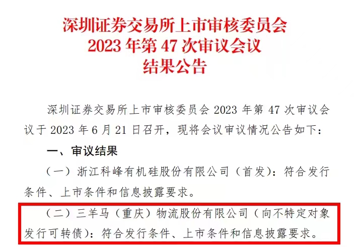 6月21日,深交所上市委員會(huì)2023年第47次審議會(huì)議結(jié)果顯示,三羊馬(001317)(001317)向不特定對象發(fā)行可轉(zhuǎn)債的申請獲通過。