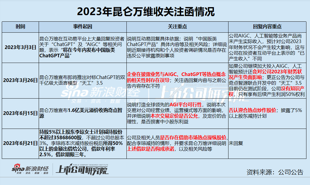 需要注意的是,今年3月,昆侖萬(wàn)維就連續(xù)兩次收到了深交所的關(guān)注函,起因是昆侖萬(wàn)維在投資者互動(dòng)平臺(tái)上回復(fù)ChatGPT、AIGC相關(guān)問(wèn)題,后續(xù)推出大模型“天工”等,但公告具體披露的內(nèi)容卻與投資者互動(dòng)平臺(tái)表述以及回復(fù)函中的相關(guān)內(nèi)容存在不符。