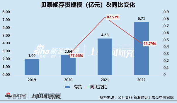 貝泰妮持續(xù)增長的存貨規(guī)模和下滑的存貨周轉(zhuǎn)能力,同樣是值得關(guān)注的問題。近年來,貝泰妮的存貨規(guī)模持續(xù)攀升,截至2022年底,貝泰妮的存貨規(guī)模高達(dá)6.71億元,同比增長44.79%。