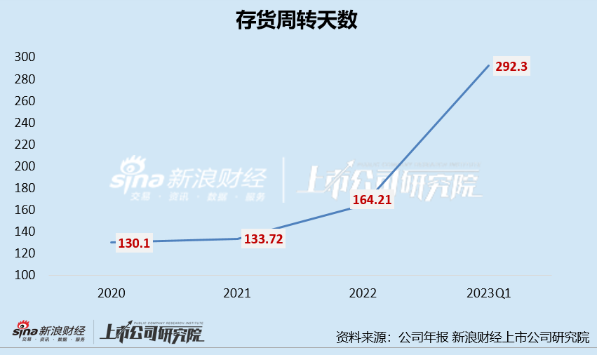 存貨規(guī)模持續(xù)攀升的同時(shí),公司存貨周轉(zhuǎn)效率也在持續(xù)下滑。2020-2022年,公司存貨周轉(zhuǎn)天數(shù)分別為130.1天、133.72天、164.21天。2023年,公司存貨考量指標(biāo)依舊未見好轉(zhuǎn),2023年一季度公司存貨規(guī)模為6.69億元,同比增長37.49%,存貨周轉(zhuǎn)天數(shù)進(jìn)一步增長至292.30天,同比增長22.63%。