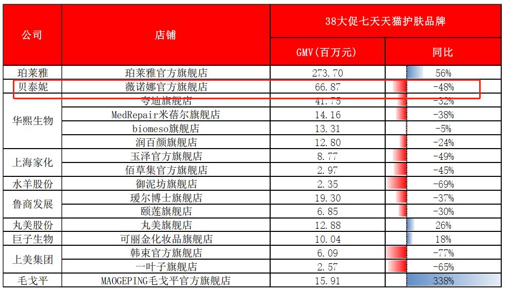 據(jù)首創(chuàng)證券(601136)統(tǒng)計(jì)的2023年天貓“3.8煥新周”促銷活動(dòng)美妝品牌官旗銷售情況,貝泰妮核心品牌薇諾娜官方旗艦店2023年38大促7天交易金額為0.67億元,同比下降了48%。