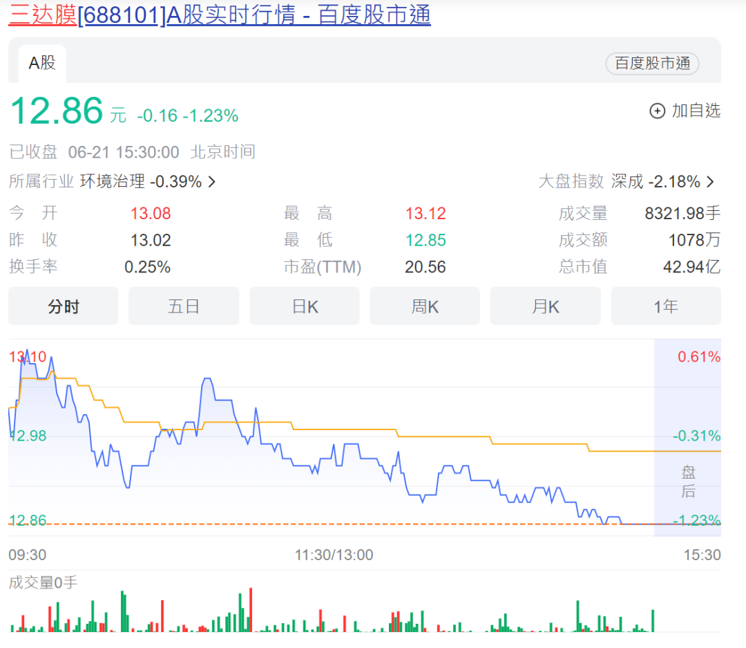 目前三達(dá)膜股價(jià)報(bào)12.86元/股,總市值42.94億元。