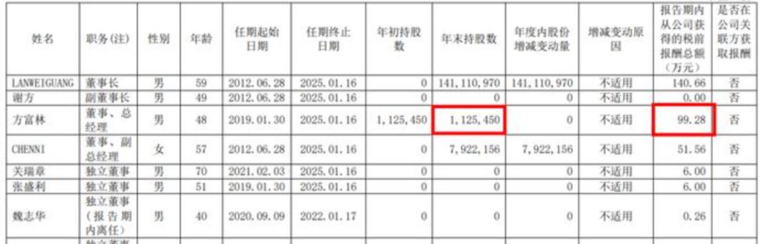 截至2022年12月31日,方富林持股112.54萬股,期末參考持股市值1455萬,薪酬與期末持股市值合計(jì)1554萬元。