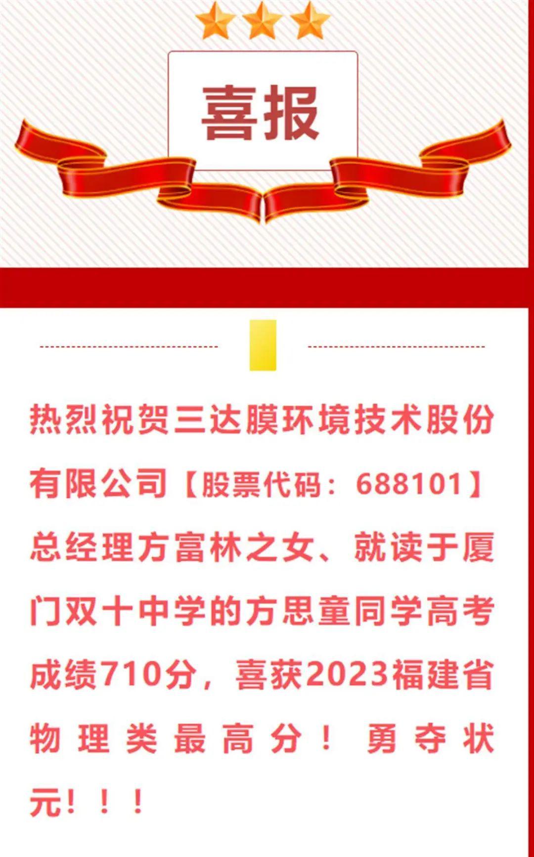 科創(chuàng)板上市公司三達(dá)膜24日官微發(fā)布消息稱,該公司總經(jīng)理方富林之女、就讀于廈門雙十中學(xué)的方思童同學(xué),高考成績(jī)710分,喜獲2023福建省物理類最高分,勇奪狀元。