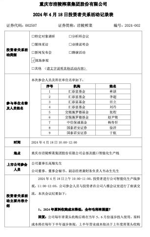 投資者關(guān)心,2024年原料收購成本降低,全年毛利率展望?涪陵榨菜回復(fù):公司每年青菜頭收購后將在當年5、6月份逐步投入使用,原料成本將在每年下半年逐步體現(xiàn),上半年營業(yè)成本取決于上年度青菜頭收購價格,青菜頭收購價去年同期約為1100元/噸,全年整體來看原料收購價格降低對毛利率影響不大。