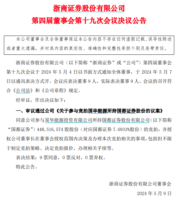 5月7日,浙商證券董事會審議通過《關(guān)于參與競拍國華能源所持國都證券股份的議案》,同意公司參與國華能源投資有限公司所持國都證券448,516,574股股份(對應(yīng)國都證券7.6933%股份)的競拍,并授權(quán)公司董事長在董事會授權(quán)范圍內(nèi)決策及辦理本次競拍相關(guān)的事項,包括但不限于制定競拍策略、決定競拍報價、辦理相關(guān)手續(xù)等。