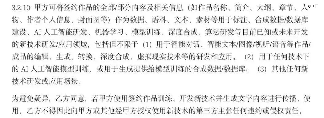 所謂的“AI訓練補充協(xié)議”,即2023年底起番茄小說陸續(xù)在簽約作品合作協(xié)議中新增的3.2.10條款。其中提到:“甲方(番茄小說)可將簽約作品的全部/部分內(nèi)容及相關(guān)信息(如作品名稱、簡介、大綱、章節(jié)、人物、作者個人信息、封面圖等)作為數(shù)據(jù)、語料、文本、素材等用于標注、合成數(shù)據(jù)/數(shù)據(jù)庫建設(shè)、AI人工智能研發(fā)、機器學習、模型訓練、深度合成、算法研發(fā)等目前已知或未來開發(fā)的新技術(shù)研發(fā)/應用領(lǐng)域?!?/p>