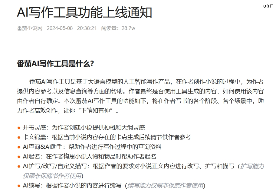 AI與網(wǎng)絡文學創(chuàng)作結(jié)合的例子,不只是番茄小說一家。