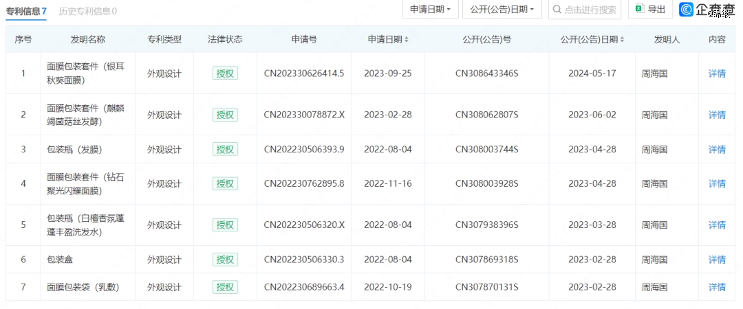 而實際上,F(xiàn)B雖然營銷用語看起來高端且富有科技感,可一直也并沒有顯示出太多的科技證據(jù)。拿簡單的專利技術(shù)一項來說,根據(jù)企查查顯示,范美麗(海南)化妝品有限公司名下有7項專利信息,無一例外全部是外觀設(shè)計專利。