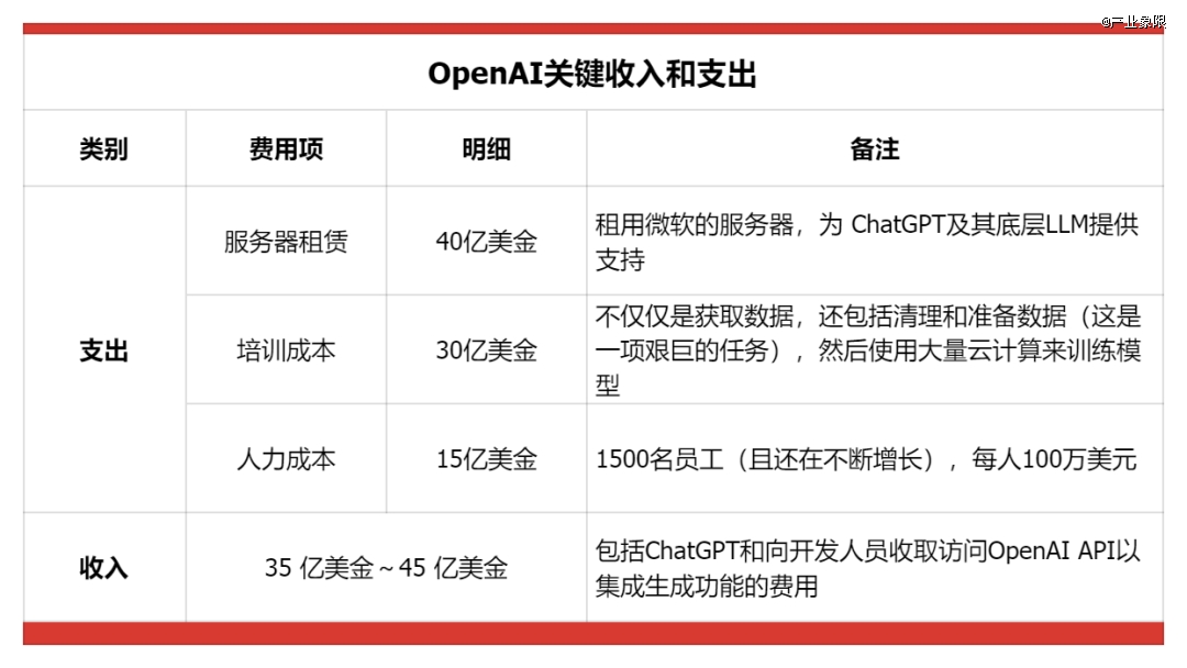美國科技媒體The Information做過一個測算,按照OpenAI的支出,其2024年的費用可能高達85億美元,即算上35億美元的收入,其2024年的虧損也將高達50億美金。