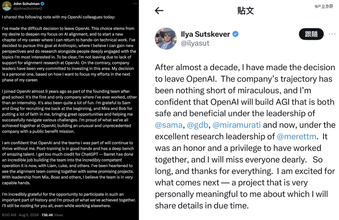 8月6日,OpenAI聯(lián)合創(chuàng)始人John Schulman在X上正式宣布離職,他的離職感言文風(fēng)與3 個月前官宣離職的Ilya Sutskever如出一轍。