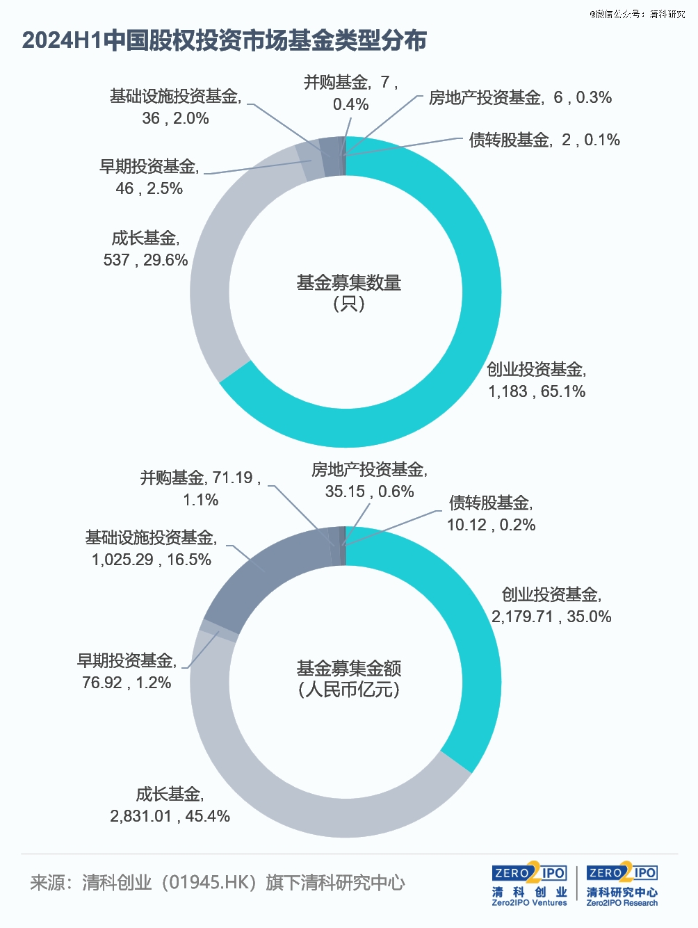 2024年上半年,創(chuàng)業(yè)投資基金數(shù)量持續(xù)*,占比維持在60%以上。據(jù)統(tǒng)計(jì),共有1,183只創(chuàng)業(yè)投資基金完成新一輪募集,數(shù)量同比下降50.1%;募資規(guī)模為2,179.71億元人民幣,占比35.0%,相比去年同期下降了1.4pct。537只成長基金的募資規(guī)模合計(jì)達(dá)到2,831.01億元人民幣,數(shù)量和金額占全市場的比重分別較2023年上半年提高了0.2pct、2.9pct。
