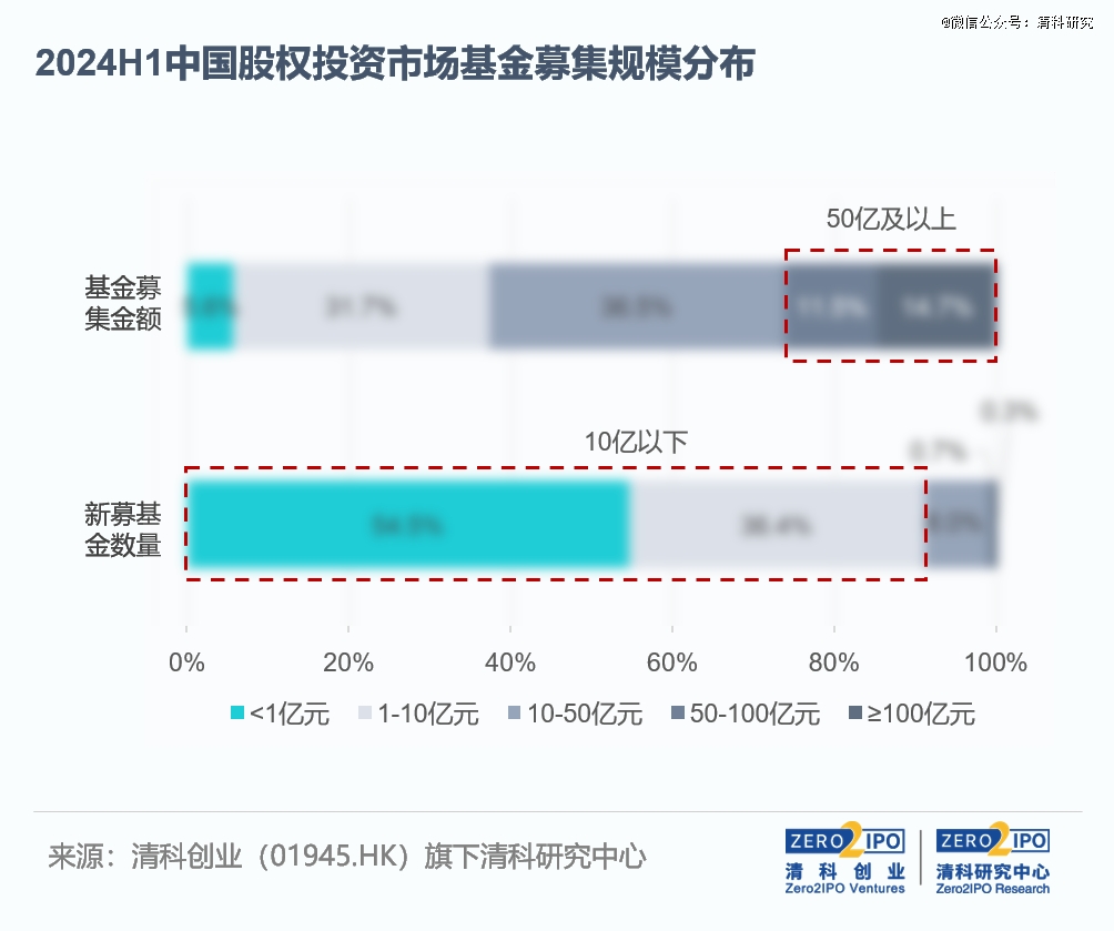 2024年上半年中國股權(quán)投資市場新募集基金仍以小規(guī)?;馂橹?,新募規(guī)模不足1億元人民幣的基金數(shù)量占比保持在五成以上。而其總募資規(guī)模不足400億元人民幣,占比僅為5.6%,相較2023年同期下降了3.8pct。大額基金的設(shè)立與募集相對(duì)穩(wěn)定,上半年共有19只基金的新募集規(guī)模在50億元及以上,合計(jì)募資規(guī)模為1,634.03億元人民幣,占比超過全市場募資總規(guī)模的1/4。