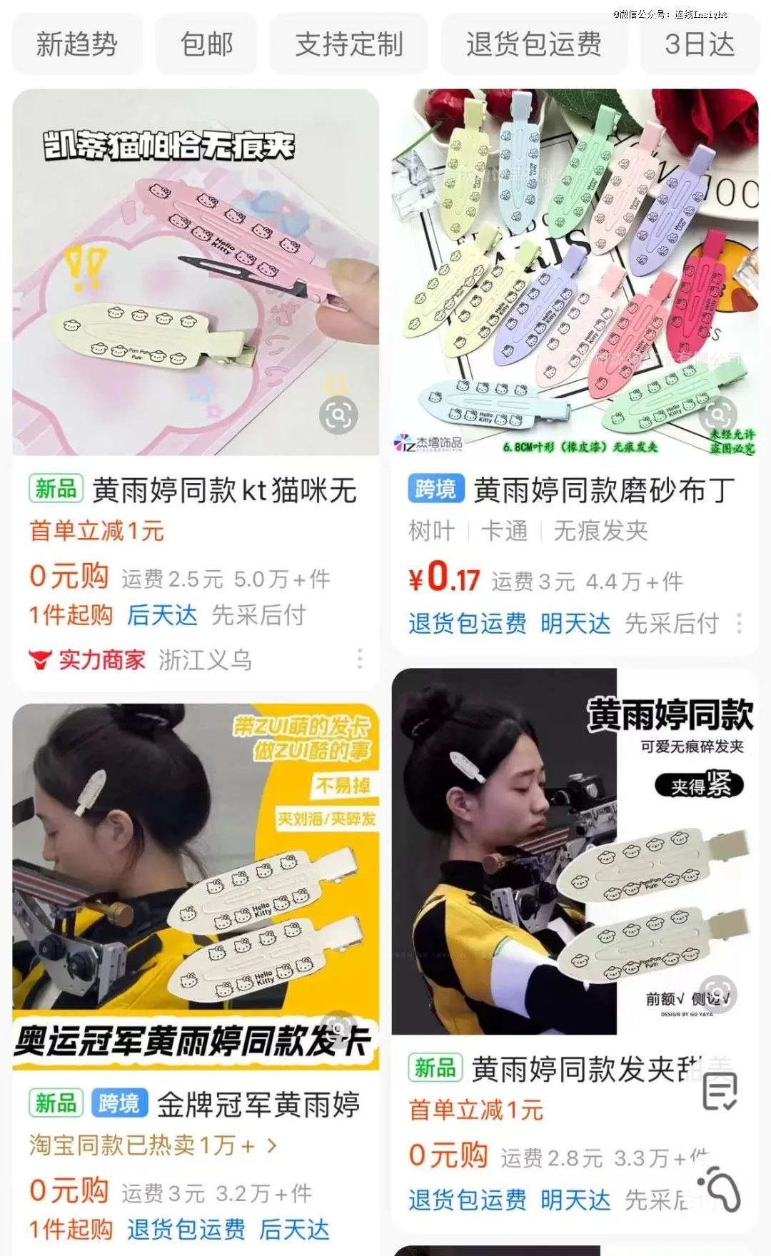 運(yùn)動(dòng)員們就是行走的帶貨達(dá)人,其佩戴的小配飾也能吸引關(guān)注。全紅嬋的丑魚拖鞋、鄭欽文的同款發(fā)箍;黃玉婷的同款劉海夾、不少運(yùn)動(dòng)員佩戴過的沙雕五環(huán)眼鏡等單品爆紅網(wǎng)絡(luò),同款產(chǎn)品在1688、拼多多等平臺(tái)上獲得了極高的銷量。