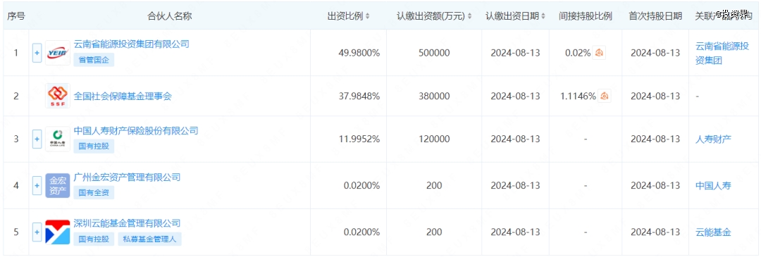 基金此次出資方均來(lái)頭不小——云南省能源投資集團(tuán)有限公司出資48.98%,社?;鸪鲑Y37.9848%,中國(guó)人壽財(cái)產(chǎn)保險(xiǎn)股份有限公司出資11.9952%,廣州金宏資產(chǎn)管理有限公司出資0.02%,深圳云能基金管理有限公司出資0.02%。