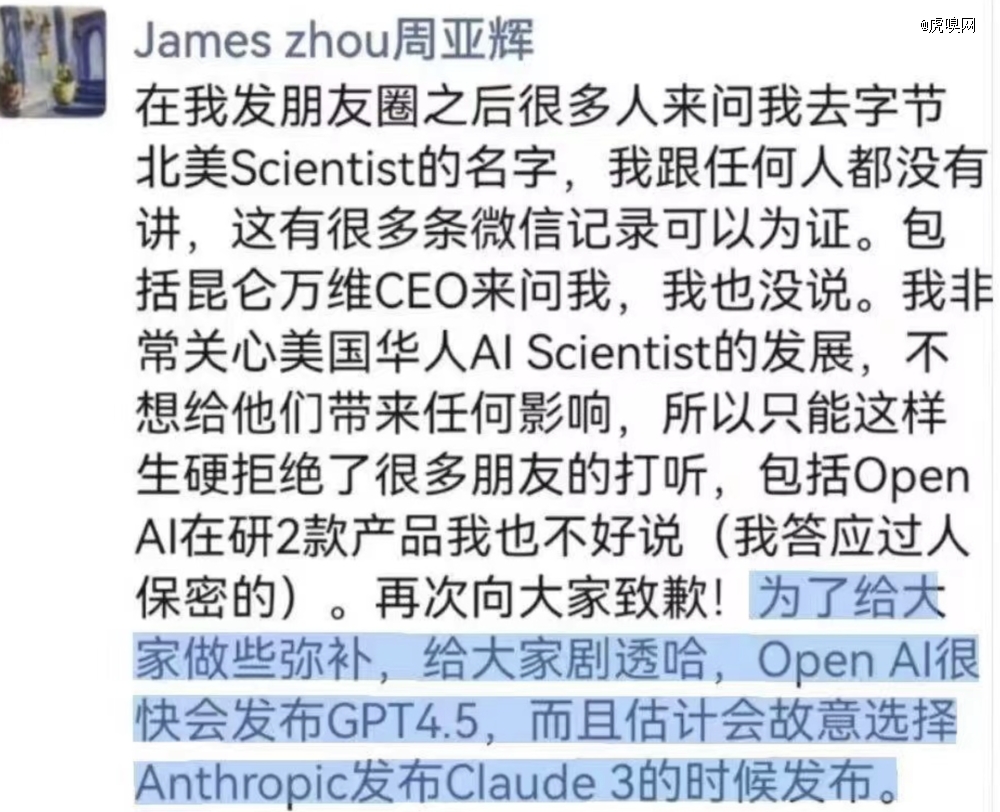 疑似周亞輝在朋友圈透漏 GPT4.5 發(fā)布時(shí)間