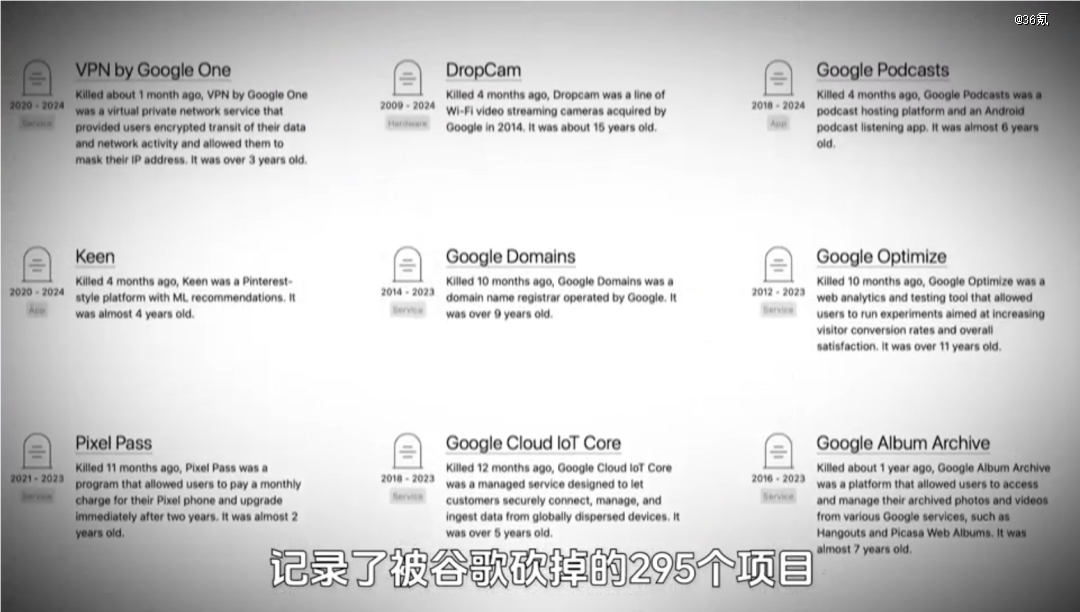 相比于Open AI產(chǎn)品的一目了然(Open AI官網(wǎng)),谷歌的產(chǎn)品開發(fā)可以用眼花繚亂來形容。這個(gè)網(wǎng)站上:https://killedbygoogle.com/ 記錄了被谷歌砍掉的295個(gè)項(xiàng)目(包含AI與非AI)。