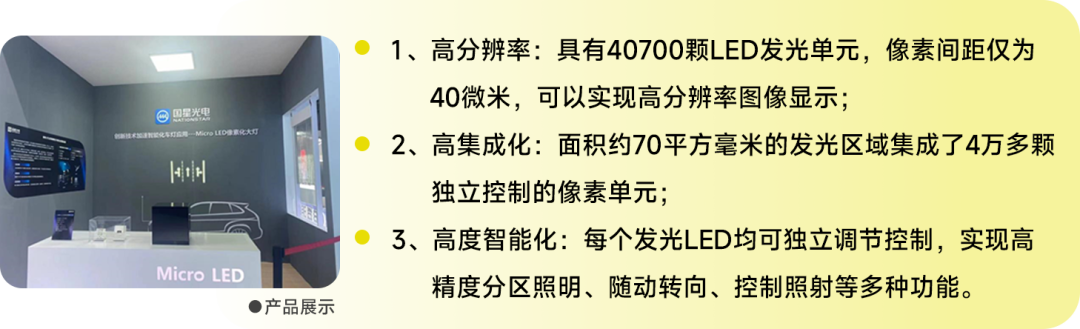 智能汽車時代需要更多智能交互的功能,除了車內交互之外,車輛與外部交互也將由燈光系統(tǒng)承擔。國星光電開發(fā)出的萬級像素智能化大燈Micro LED光源,通過采用共晶鍵合技術將微米級Micro LED藍光芯片陣列整合集成到CMOS控制電路上,實現(xiàn)Micro LED陣列中單個像素獨立控制,搭配高光效白光轉換介質,可實現(xiàn)萬級像素高品質圖像顯示。