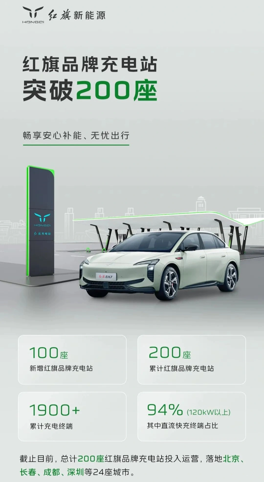 截止目前,總計(jì) 200 座紅旗品牌快充站投入運(yùn)營,落地北京、長春、成都、深圳等 24 座城市。