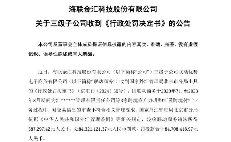 9月13日晚間,海聯(lián)金匯(002537)公告,公司三級(jí)子公司聯(lián)動(dòng)優(yōu)勢(shì)電子商務(wù)有限公司(以下簡(jiǎn)稱(chēng)“聯(lián)動(dòng)商務(wù)”)被國(guó)家外匯管理局北京市罰沒(méi)8470.84萬(wàn)元。