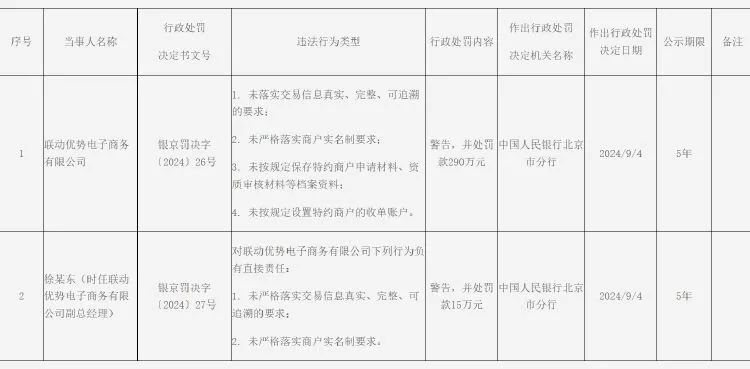 值得注意的是,這已經(jīng)是聯(lián)動(dòng)商務(wù)本月內(nèi)第二次遭到處罰。中國(guó)人民銀行北京市分行網(wǎng)站日前披露的行政處罰信息顯示,聯(lián)動(dòng)商務(wù)被罰290萬(wàn)元,時(shí)任副總經(jīng)理被罰15萬(wàn)元,處罰決定日期為9月4日。