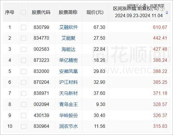 截至11月4日,本輪牛市中表現(xiàn)*的10家公司,有8家來自北交所。*牛股艾融軟件,只花了13天的時(shí)間,就完成了10倍股的壯舉,成為本輪行情中的*只十倍,同時(shí)也創(chuàng)下了A股30多年來最快的10倍股記錄。