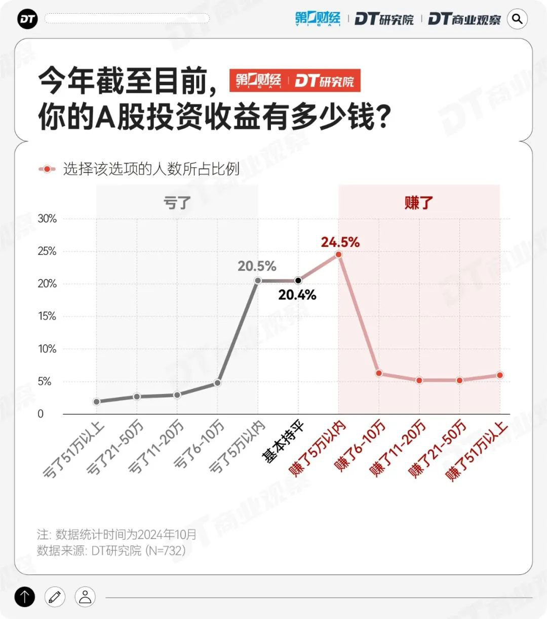 不過,大多數(shù)人都是小賺小虧,24.5%的人在A股賺了不到5萬元,20.5%的人虧損了不到5萬。
