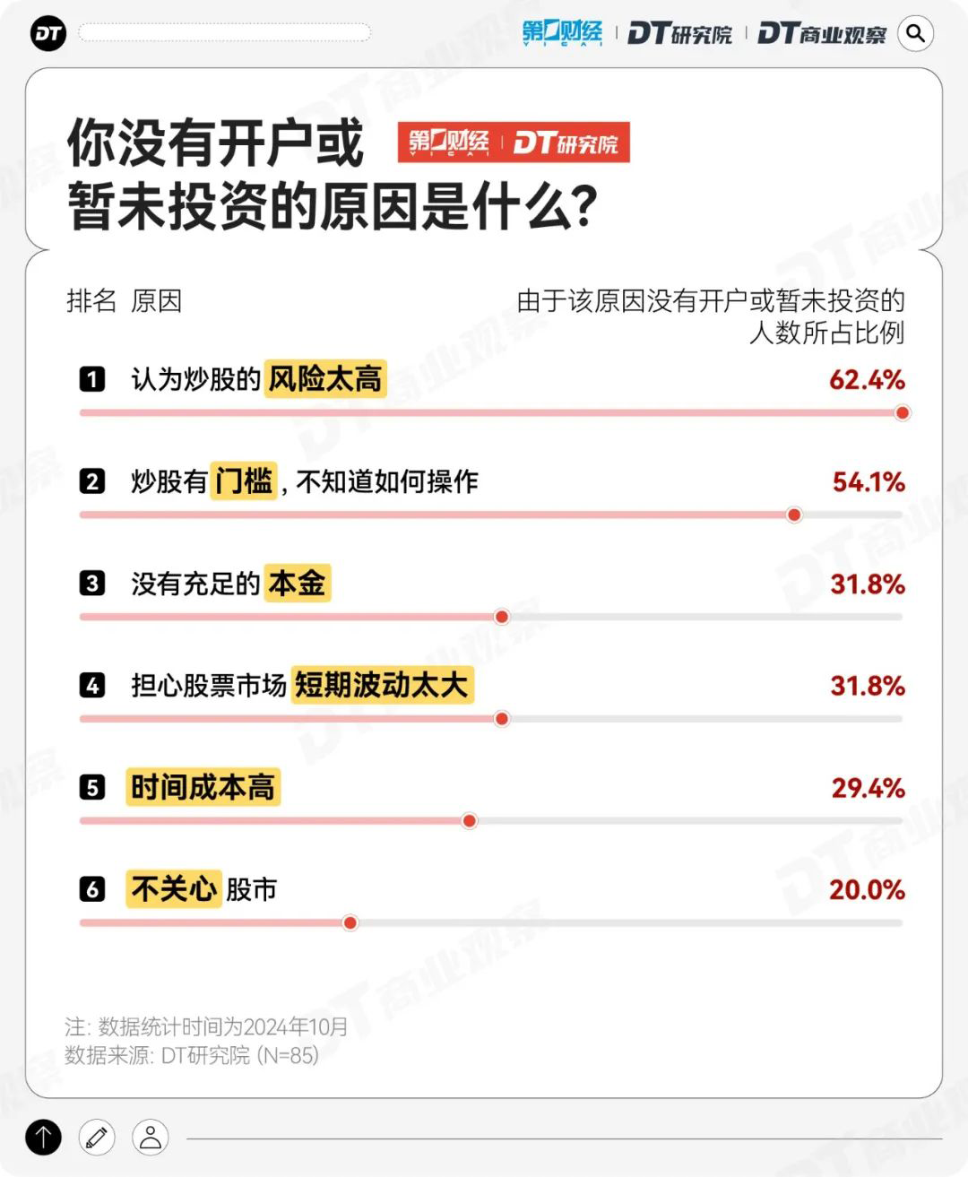 在本次調(diào)研中,我們也針對不炒股的人群進行了詢問,發(fā)現(xiàn)“風險太高”是他們不涉足股市的首要原因。