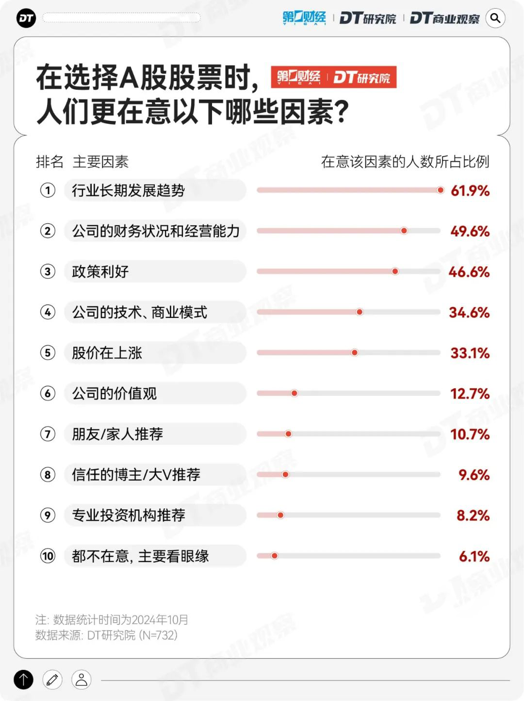 具體來說,61.9%的人看重行業(yè)的長期發(fā)展趨勢,49.6%的人關(guān)注公司財務狀況和經(jīng)營能力,46.6%的人重視政策利好。