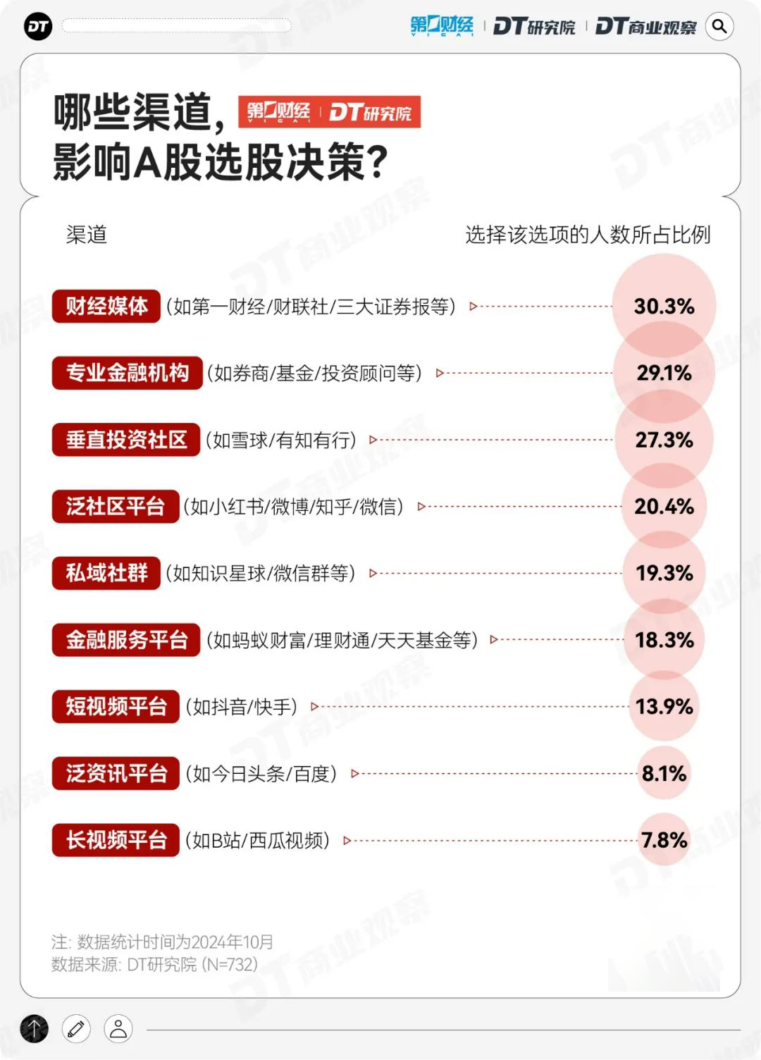 調(diào)研數(shù)據(jù)顯示,財經(jīng)媒體(如*財經(jīng)/財聯(lián)社/三大證券報等)、專業(yè)金融機構(gòu)(如券商/基金/投資顧問等)、垂直投資社區(qū)(如雪球/有知有行),依舊是大家做出炒股決策的主要信息渠道,分別占比30.3%、29.1%和27.3%。