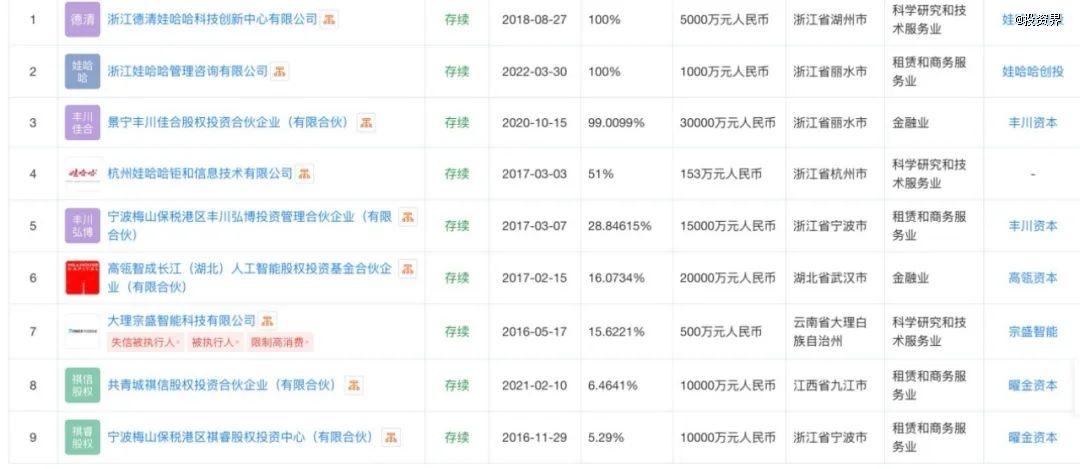 不止于此,宗馥莉本人也涉足創(chuàng)投圈已久。成立于2015年的寧波瑾匯投資管理有限公司是其個(gè)人投資平臺(tái),由她100%持股。