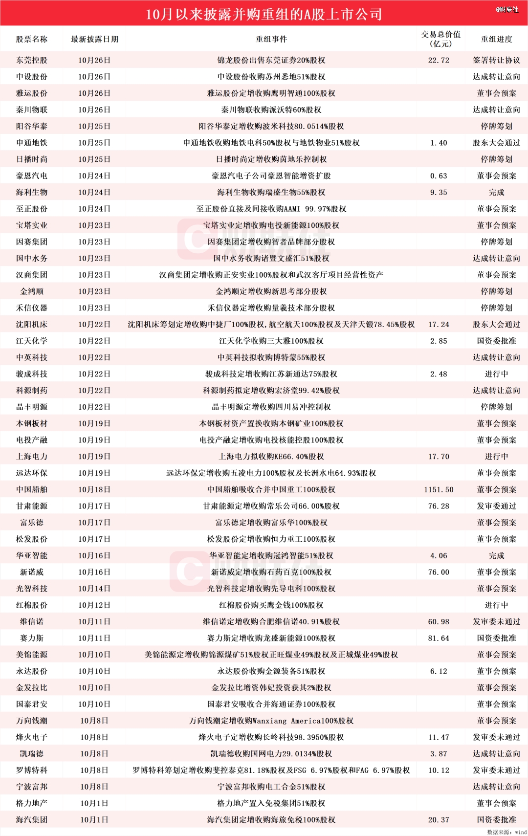據(jù)Wind數(shù)據(jù)統(tǒng)計(jì),剔除重組失敗、出讓方、ST股,10月以來(lái)披露并購(gòu)重組進(jìn)展的A股上市公司共有47家,分別為東莞控股、中設(shè)股份、雅運(yùn)股份、秦川物聯(lián)、陽(yáng)谷華泰、申通地鐵、日播時(shí)尚、豪恩汽電、海利生物、至正股份、寶塔實(shí)業(yè)、因賽集團(tuán)、國(guó)中水務(wù)、漢商集團(tuán)、金鴻順、禾信儀器、沈陽(yáng)機(jī)床、江天化學(xué)、中英科技、駿成科技、科源制藥、晶豐明源、本鋼板材、電投產(chǎn)融、上海電力、遠(yuǎn)達(dá)環(huán)保、中國(guó)船舶、甘肅能源、富樂(lè)德、松發(fā)股份、華亞智能、新諾威、光智科技、紅棉股份、維信諾、賽力斯、美錦能源、永達(dá)股份、金發(fā)拉比、國(guó)泰君安、萬(wàn)向錢(qián)潮、烽火電子、凱瑞德、羅博特科、寧波富邦、格力地產(chǎn)和海汽集團(tuán)。具體情況如下圖: