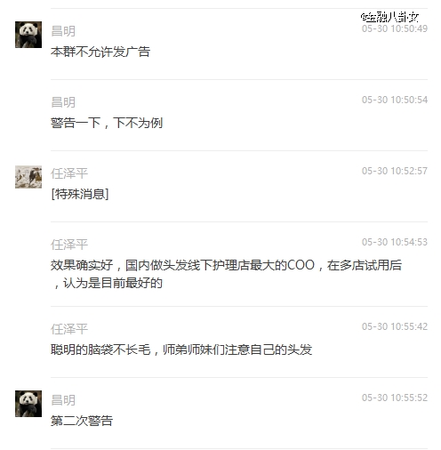 但網(wǎng)紅經(jīng)濟學(xué)家或許也被當(dāng)成了微商,群主立馬站出來兩次警告不能發(fā)廣告,令人哭笑不得。
