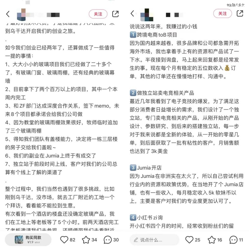 如今,這位博主已經(jīng)去非洲創(chuàng)業(yè)兩年了,她還公開了一些自己的“生財之道”,除了一些當(dāng)?shù)氐拇箜椖?,也賺過一些小錢~