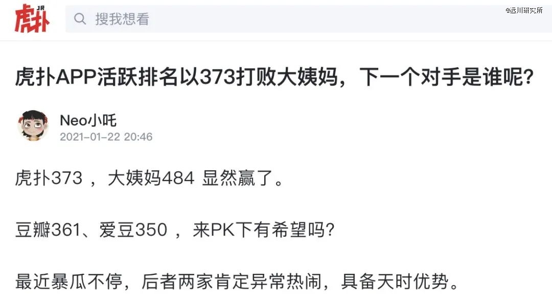 三年后,虎撲月活縮水得不足十分之一,同在一份APP活躍度榜單上,高攀不上破億的小紅書(shū),競(jìng)爭(zhēng)不過(guò)700多萬(wàn)的豆瓣,對(duì)標(biāo)對(duì)象慘遭消費(fèi)降級(jí),變成一款叫“大姨媽月經(jīng)期助手”的APP[9]。