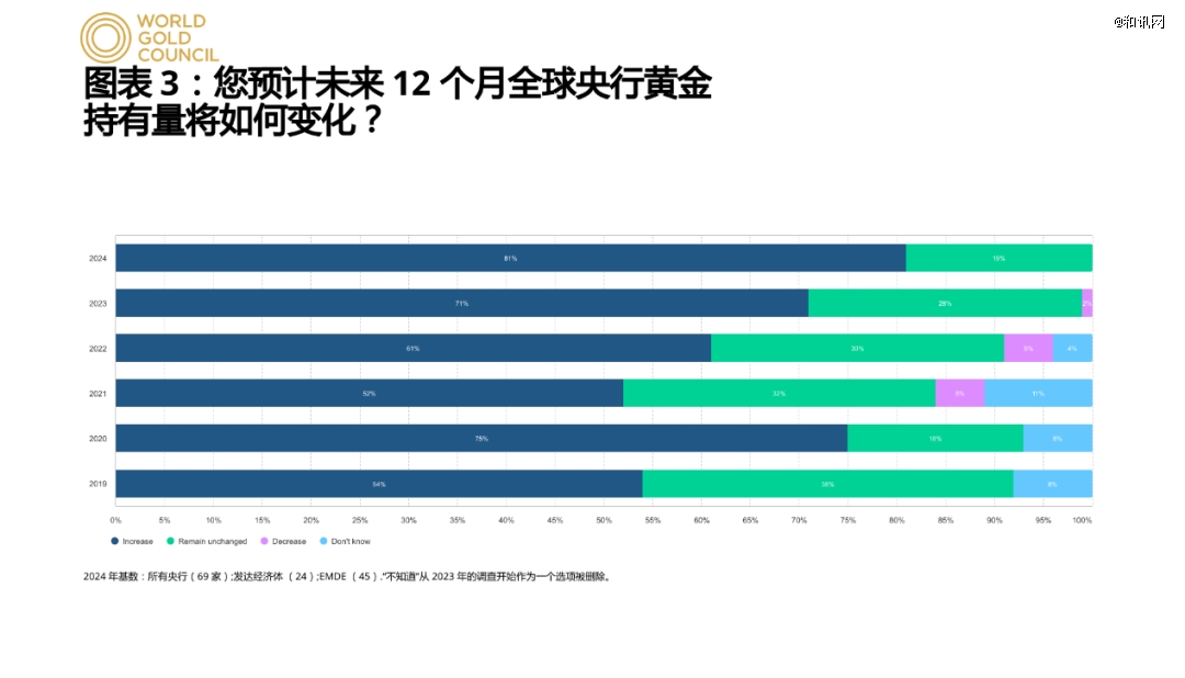 對于未來央行能否保持增持黃金的熱情,世界黃金協(xié)會在2024年央行黃金儲備調(diào)查報告中指出,通過梳理70份有效調(diào)查回復(fù),有29%的央行受訪者計劃在未來12個月內(nèi)增加黃金儲備,而這一比例是2018年開始此項調(diào)查以來的最高水平。同時這份報告還指出,有81%的央行受訪者認(rèn)為未來12個月全球各國央行黃金持有量將進(jìn)一步增加。
