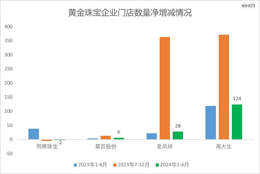 從黃金珠寶上市企業(yè)的財報獲悉,截至2024年6月末,菜百股份擁有93 家直營連鎖門店,較年初凈增加6家,增加數(shù)量不及2023年下半年的13家,而同期老鳳祥的銷售網(wǎng)點(diǎn)增加了28家,與2023年下半年的363家相差甚遠(yuǎn)。此外,明牌珠寶的門店數(shù)量在去年上半年凈減少了2家。