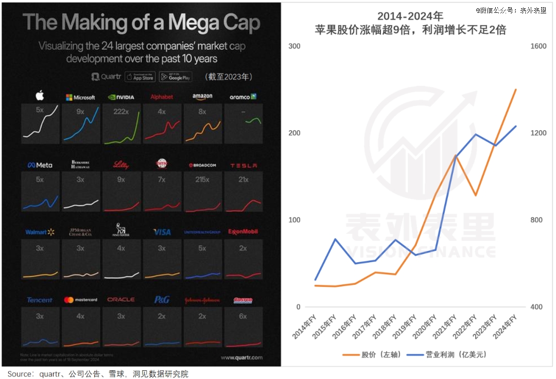 在過去10年的牛市里,美股巨頭們股價(jià)狂飆,增長(zhǎng)四五倍稀松平常,十倍、百倍地暴漲也不少見,天量財(cái)富在這一過程中被“創(chuàng)造”了出來。然而,許多公司的利潤(rùn),實(shí)際遠(yuǎn)遠(yuǎn)低于股價(jià)增速。