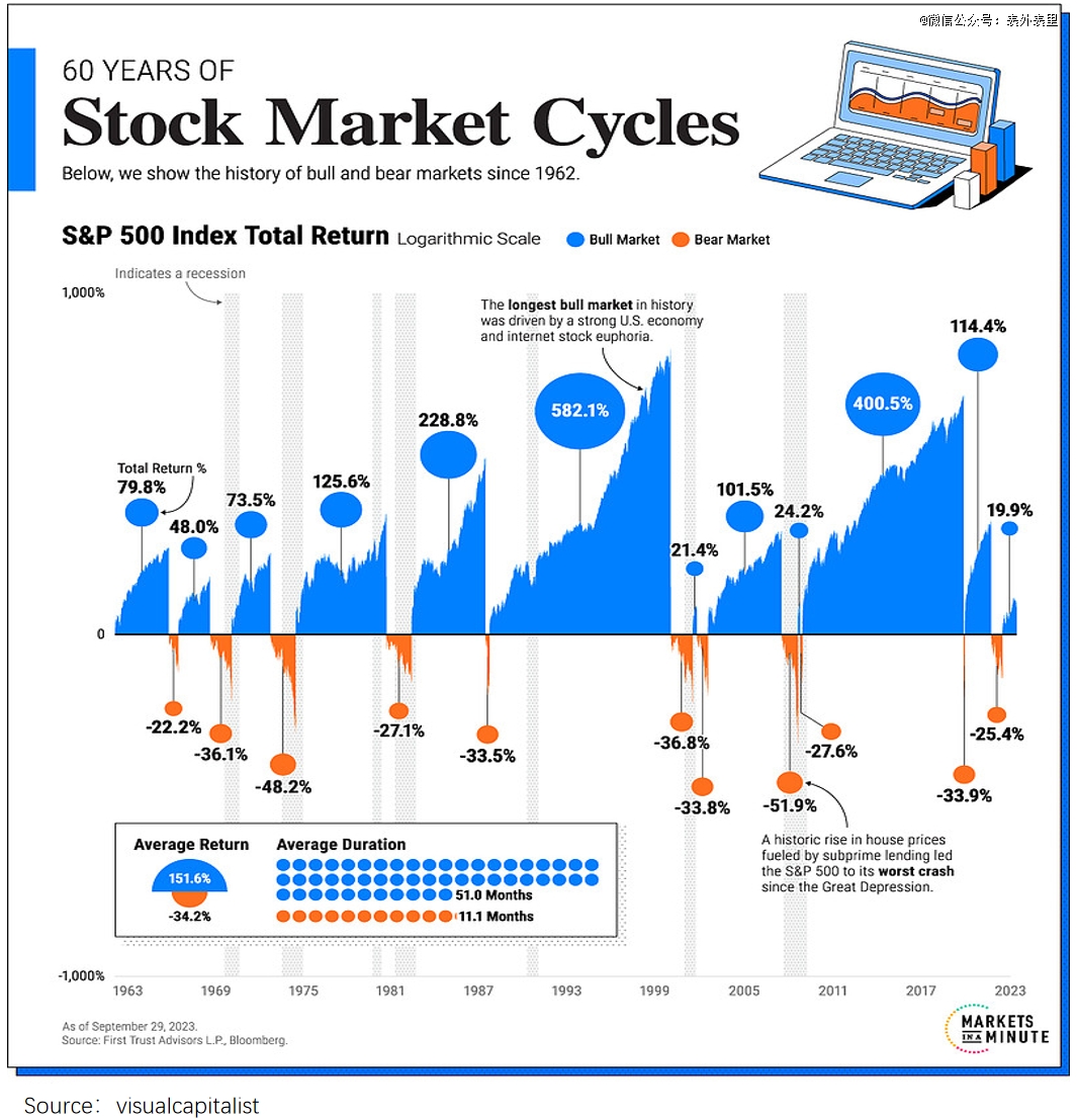 回顧美股1961年以來的60多年歷史會(huì)發(fā)現(xiàn),美股的牛市比熊市要長(zhǎng)得多——牛市平均持續(xù)63個(gè)月,平均漲幅達(dá)到182%;熊市平均持續(xù)時(shí)長(zhǎng)14個(gè)月,平均跌幅只有36%。