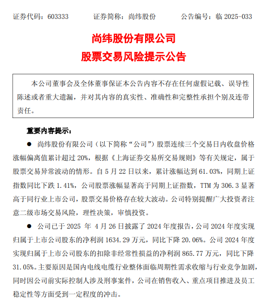5月28日,尚緯股份(603333)(603333.SH)因股價(jià)異常波動(dòng)發(fā)布風(fēng)險(xiǎn)提示公告。這家曾因?qū)嵖厝瞬倏v證券市場(chǎng)獲刑的電纜企業(yè),在福華化學(xué)入主后股價(jià)連續(xù)4日漲停,市值突破56億元。