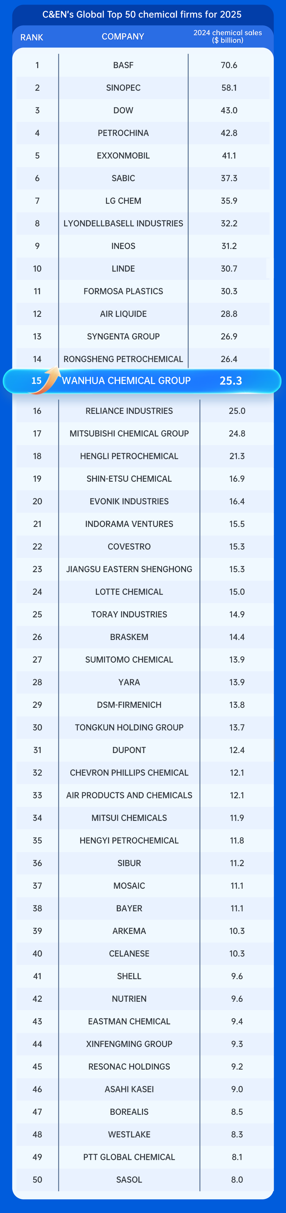 7月23日,C&EN(《化學與工程新聞》)發(fā)布最新全球化工企業(yè)50強排行榜(Global Top 50 Chemical Firms),對全球范圍內(nèi)主要化工企業(yè)進行了排名,萬華化學(600309)位列第15位,較去年上升1位。