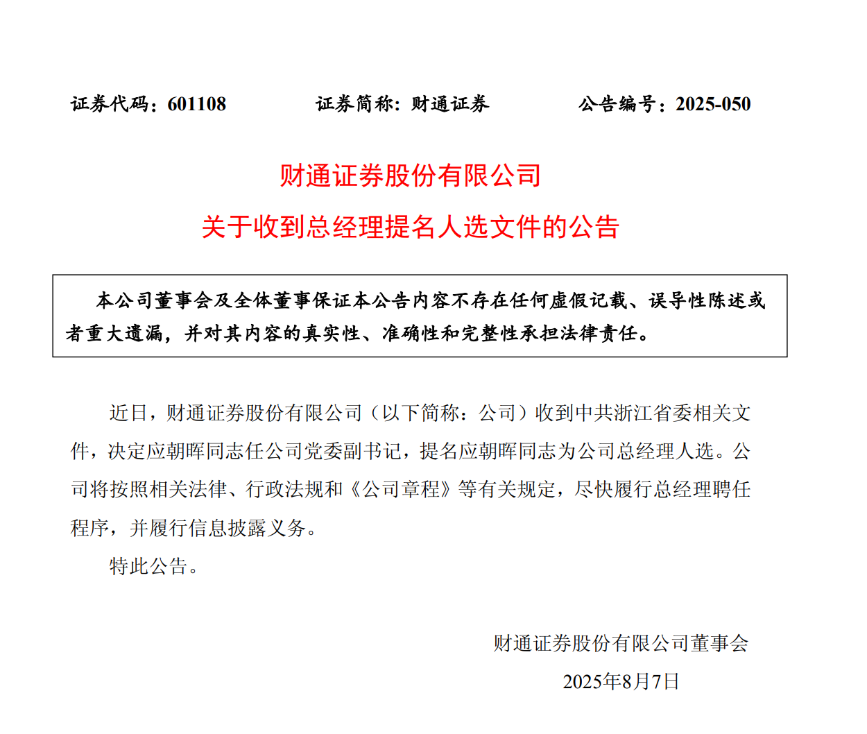 8月7日,財(cái)通證券發(fā)布公告稱,收到中共浙江省委相關(guān)文件,決定應(yīng)朝暉任公司黨委副書記,提名應(yīng)朝暉為公司總經(jīng)理人選。財(cái)通證券表示,公司將按照相關(guān)法律、行政法規(guī)和《公司章程》等有關(guān)規(guī)定,盡快履行總經(jīng)理聘任程序,并履行信息披露義務(wù)。