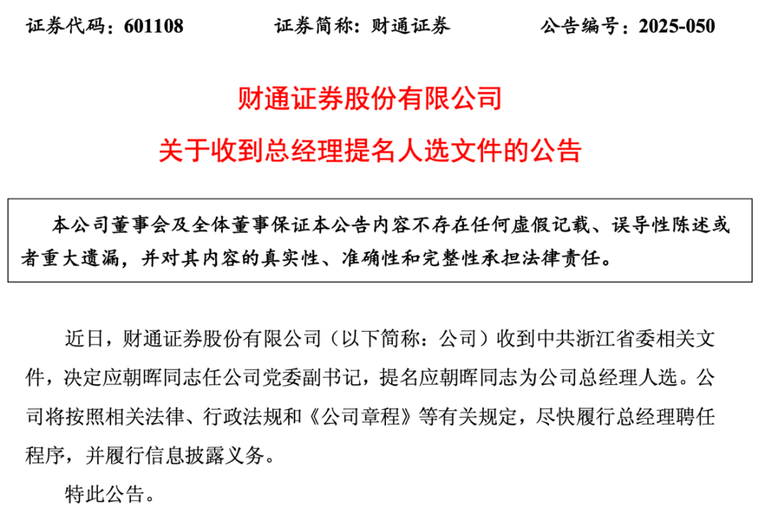 8月7日晚間,財(cái)通證券發(fā)布公告稱,提名應(yīng)朝暉為公司總經(jīng)理人選,將盡快履行總經(jīng)理聘任程序。應(yīng)朝暉原為浙江省擔(dān)保集團(tuán)有限公司(以下簡稱浙江擔(dān)保集團(tuán))黨委書記、董事長。