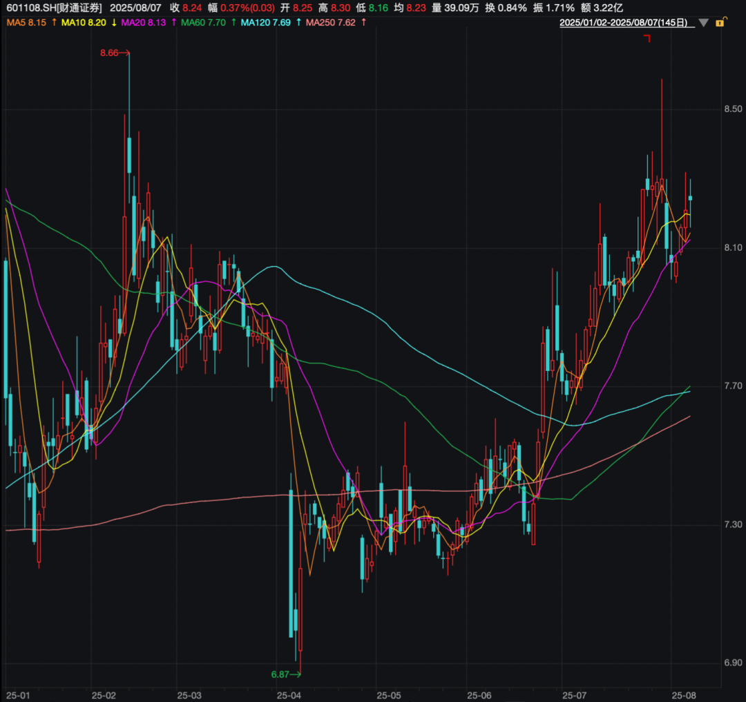 截至8月7日,財(cái)通證券最新股價(jià)為8.24元/股,總市值為383億元。