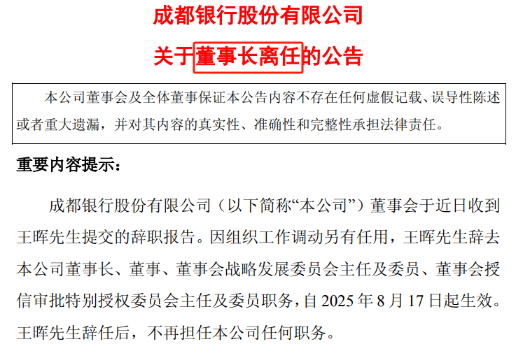 8月17日下午,成都銀行(601838)發(fā)布公告稱,公司董事會于近日收到王暉提交的辭職報告。因組織工作調(diào)動另有任用,王暉辭去公司董事長、董事、董事會戰(zhàn)略發(fā)展委員會主任及委員、董事會授信審批特別授權(quán)委員會主任及委員職務,自2025年8月17日起生效。