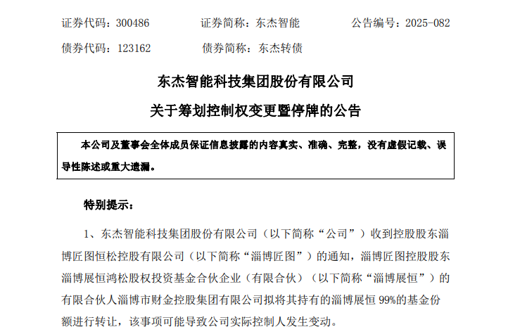 此前,東杰智能已于今年7月30日公告,淄博市財(cái)金控股集團(tuán)有限公司擬將其持有的淄博展恒99%的基金份額進(jìn)行轉(zhuǎn)讓,該事項(xiàng)可能導(dǎo)致公司實(shí)際控制人發(fā)生變動(dòng)。但因事項(xiàng)處于籌劃階段,彼時(shí)并未申請(qǐng)停牌。