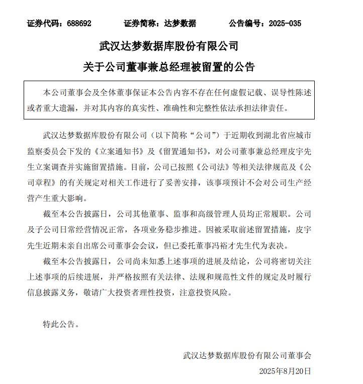 達(dá)夢(mèng)數(shù)據(jù)19日晚間發(fā)布公告稱,公司于近期收到湖北省應(yīng)城市監(jiān)察委員會(huì)下發(fā)的《立案通知書》及《留置通知書》,對(duì)公司董事兼總經(jīng)理皮宇先生立案調(diào)查并實(shí)施留置措施。目前,公司已按照《公司法》等相關(guān)法律規(guī)范及《公司章程》的有關(guān)規(guī)定對(duì)相關(guān)工作進(jìn)行了妥善安排,該事項(xiàng)預(yù)計(jì)不會(huì)對(duì)公司生產(chǎn)經(jīng)營(yíng)產(chǎn)生重大影響。