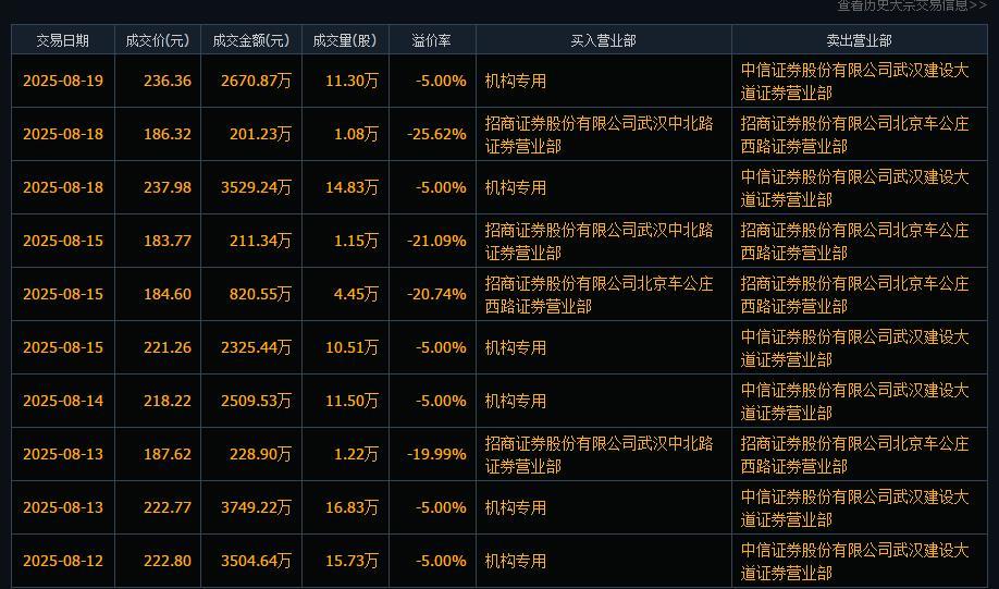二級(jí)市場(chǎng)上,截至8月19日收盤,達(dá)夢(mèng)數(shù)據(jù)跌0.68%,報(bào)248.8元/股,總市值281.7億元。不過值得注意的是,從8月12日起至19日,達(dá)夢(mèng)數(shù)據(jù)頻現(xiàn)折價(jià)交易,溢價(jià)區(qū)間為-5%至-20.74%不等,中信證券股份有限公司武漢建設(shè)大道證券營(yíng)業(yè)部和招商證券股份有限公司北京車公莊西路證券營(yíng)部頻現(xiàn)賣出。