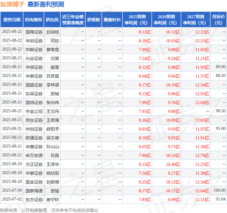太平洋證券股份有限公司郭夢(mèng)婕近期對(duì)鹽津鋪?zhàn)樱?02847)進(jìn)行研究并發(fā)布了研究報(bào)告《鹽津鋪?zhàn)樱耗в蟠髥纹肪S持高增,Q2凈利率表現(xiàn)亮眼》,上調(diào)鹽津鋪?zhàn)幽繕?biāo)價(jià)至86.48元,給予買入評(píng)級(jí)。