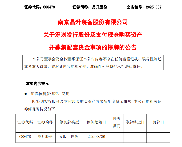 對于本次交易是否構(gòu)成重大資產(chǎn)重組及關(guān)聯(lián)交易的具體認定,晶升股份將在重組預案或重組報告書中予以詳細分析和披露。本次交易不會導致公司實際控制人發(fā)生變更,不構(gòu)成重組上市。根據(jù)相關(guān)規(guī)定,公司股票將于8月26日(星期二)開市起停牌,預計停牌時間不超過10個交易日。